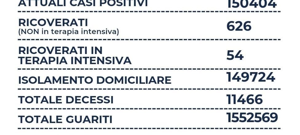 Nel Lazio su un totale di 26.341 tamponi si registrano 7.756 nuovi casi positivi (-2.093), sono 5 i decessi (=), 626 i ricoverati (+33), 54 le terapie intensive (+3) e +5.226 i guariti. Il rapporto tra positivi e tamponi è al 29,4%.