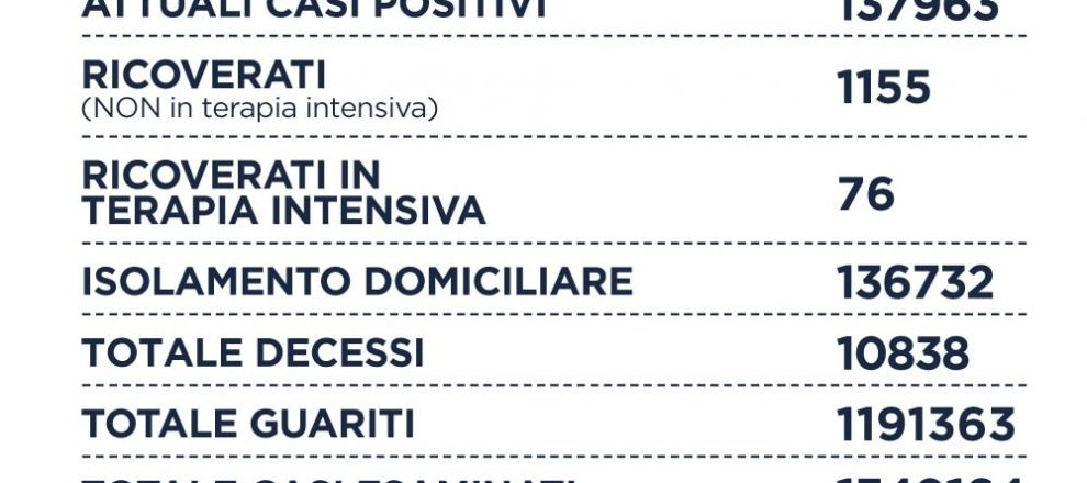 Oggi su un totale di 51.958 tamponi, si registrano 7.591 nuovi casi positivi (-191), sono 15 i decessi (+6), 1.155 i ricoverati (+3), 76 le terapie intensive (-5) e +5.220 i guariti. Il rapporto tra positivi e tamponi è al 14,6%.