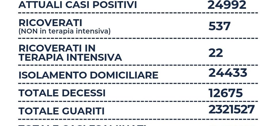 Nel Lazio su 1.912 tamponi molecolari e 7.189 tamponi antigenici per un totale di 9.051 tamponi, si registrano 761 nuovi casi positivi (-18), sono 2 i decessi (-4), sono 537 i ri-coverati (-2), 22 le terapie intensive (-1) e +1.215 i guariti. Il rapporto tra positivi e tamponi è al 8,4%. I casi a Roma città sono a quota 427.