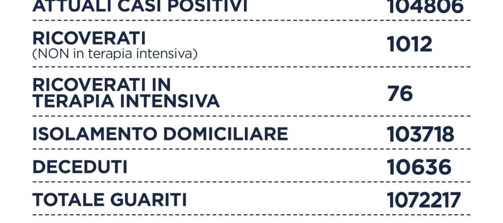 Sono 8.986 i nuovi casi positivi emersi su 53 mila tamponi processati. Il rapporto è al 16,7%. 5 i decessi, 1.012 i ricoverati (-3), 76 le terapie intensive (+1). Poco più di 6 mila i guariti.