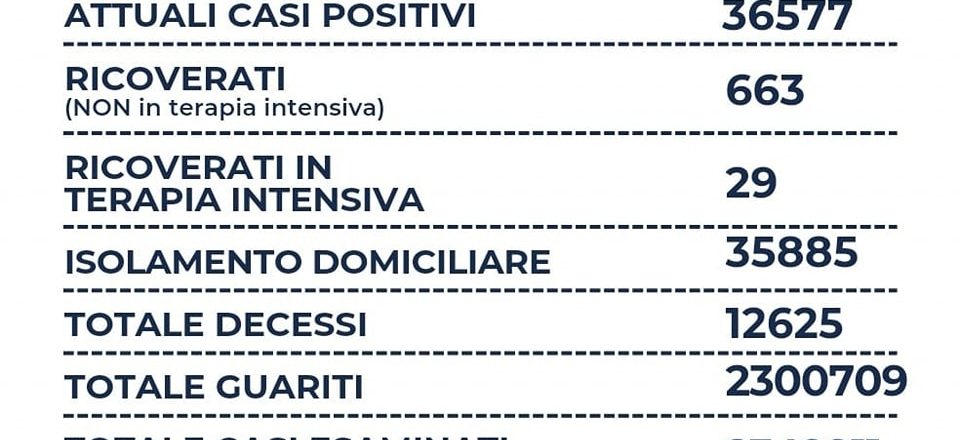 Nel Lazio su un totale di 9.470 tamponi, si registrano 956 nuovi casi positivi (-30), sono 7 i decessi ( = ), sono 663 i ricoverati ( = ), 29 le terapie intensive (+2) e +1.792 i guariti. Il rapporto tra positivi e tamponi è al 10%.