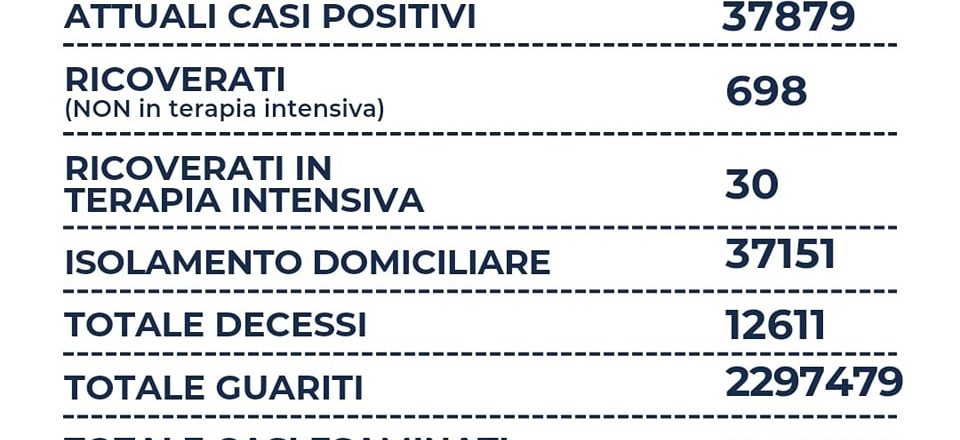 Nel Lazio su un totale di 11.823 tamponi si registrano 1.164 nuovi casi positivi (-159), sono 4 i decessi (+1), sono 698 i ricoverati (-39), 30 le terapie intensive ( = ) e +2.484 i guariti. Il rapporto tra positivi e tamponi è al 9,8%.