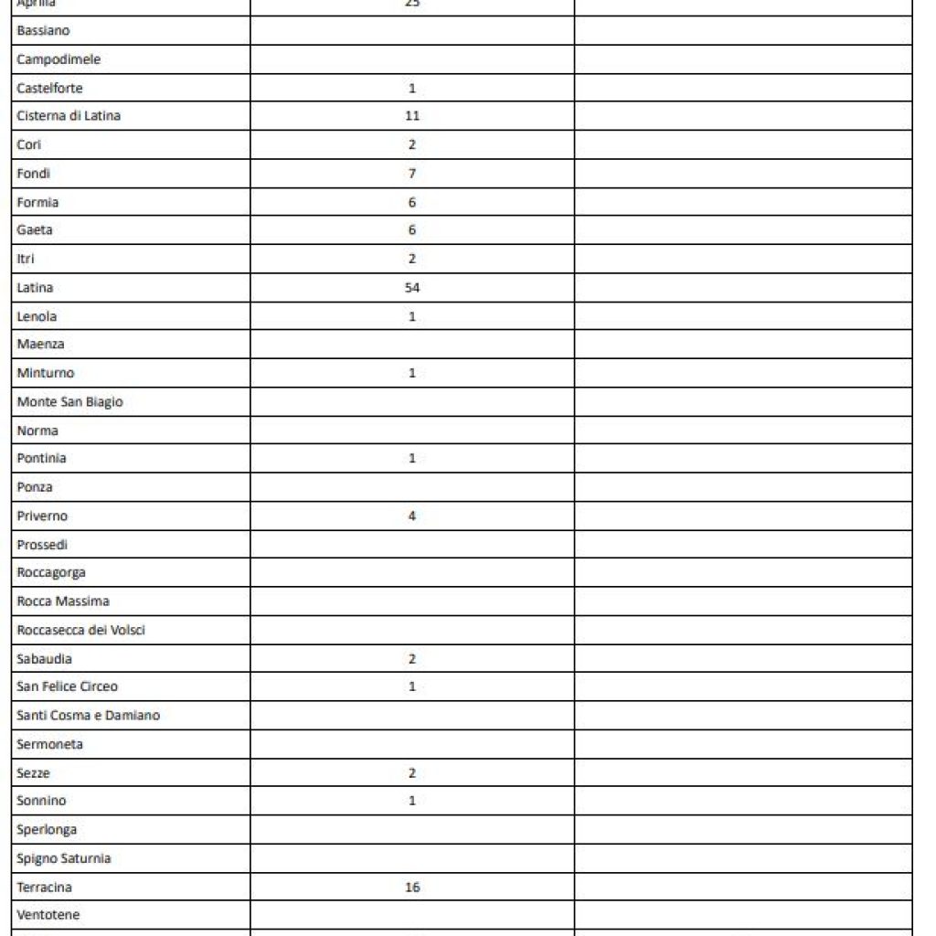 Seguono Terracina con 16, Cisterna di Latina con 11 e Fondi con 7. Poi 6 positivi a Formia e Gaeta, 4 a Priverno; 2 a Cori, Itri, Sabaudia e Sezze; 1 a Castelforte, Lenola, Minturno, Pontinia, San Felice Circeo e Sonnino. Nelle ultime 24 ore c’è stato un ricovero in più e zero guarigioni.