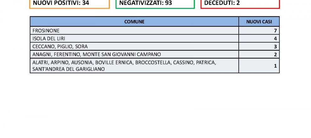 FROSINONE – Nelle ultime 24h sono stati effettuati 1630 tamponi. Abbiamo registrato 34 nuovi casi di positivi al Sars-CoV-2. Sono 93 i negativizzati.