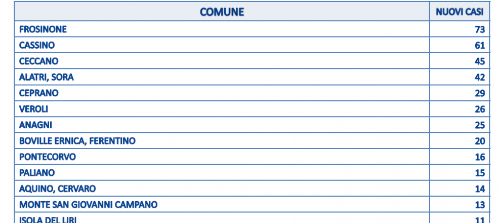 Il comune che registra il maggior numero di casi è Frosinone con 73, 61 per cassino, 45 per ceccano. Sono 42 i nuovi casi ad Alatri e Sora, 29 i contagi a Ceprano, 26 a veroli, 25 ad Anagni. Dai 20 ai tre casi sono coinvolti ben 35 casi. Dai due ad un contagio altri 23.
