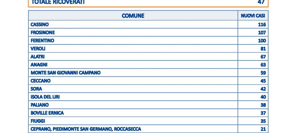 Tra i comuni che hanno superato la soglia dei 100 casi: Cassino 116, Frosinone 107, Ferentino 100. Poi sono 81 a Veroli, 67 ad Alatri, 63 ad Anagni. 84 su 91 i comuni ciociari coinvolti dal contagio.