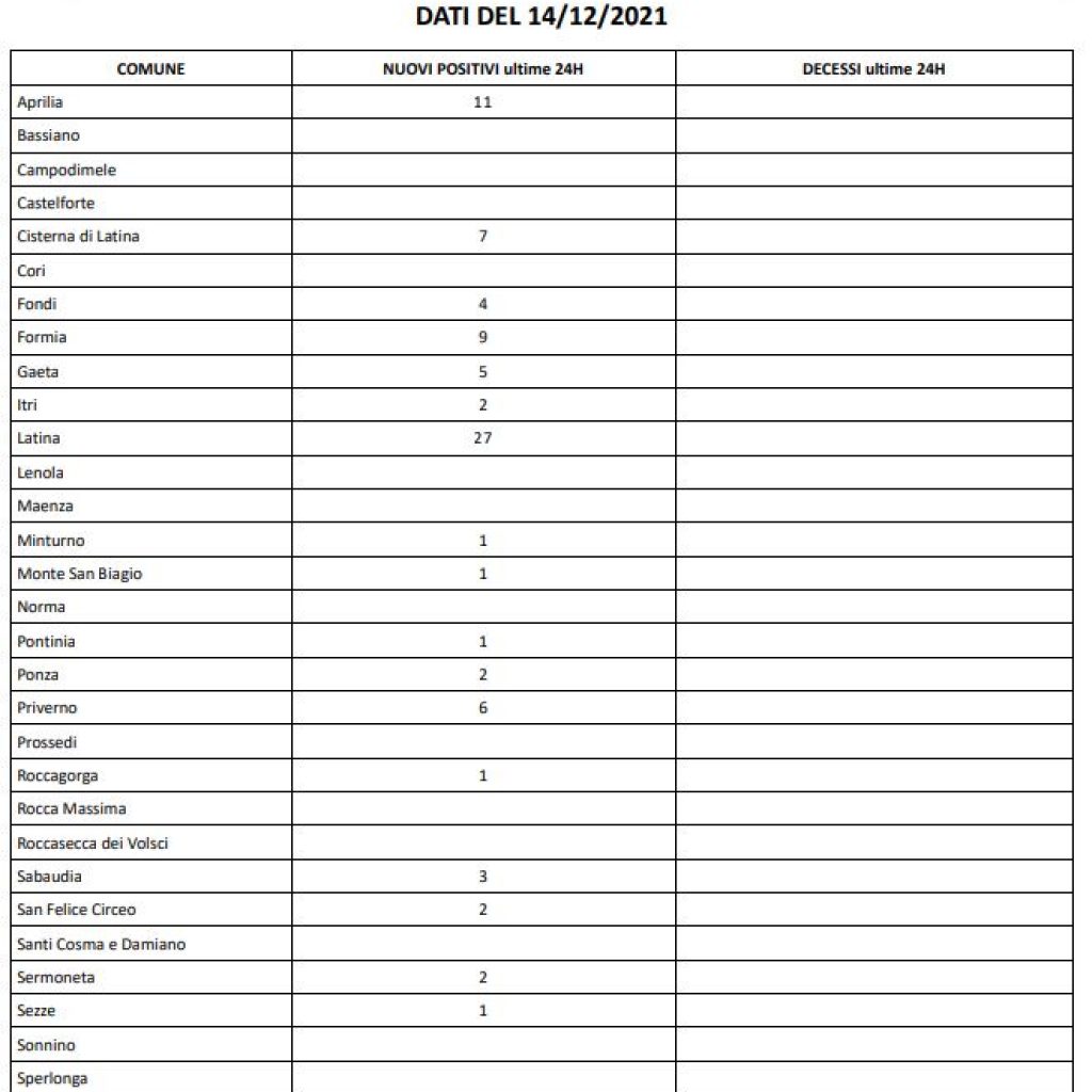 È sempre il capoluogo a contare il maggior numero di contagi con 27, seguono Aprilia con 11, Formia con 9, Cisterna di Latina con 7, Priverno con 6. Poi 5 positivi a Gaeta, 4 a Fondi e Terracina 4, 3 a Sabaudia. Sono 2 a Itri, sull’isola di Ponza, San Felice Circeo e Sermoneta e 1 a Minturno, Monte San Biagio, Pontinia, Roccagorga e Sezze.