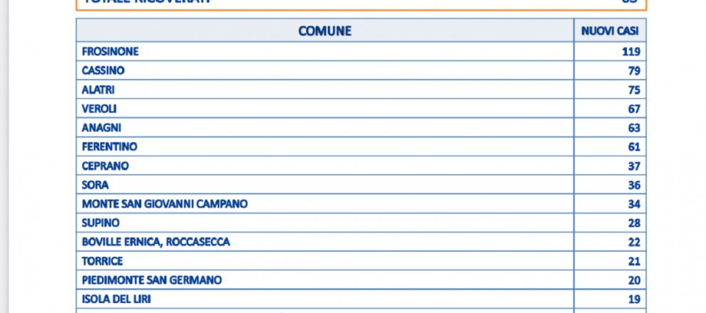 Frosinone è la città con più contagi: 119. A Cassino se ne registrano 79. Ad Alatri 75.a Veroli 67. Ad Anagni 63, a Ferentino 61.