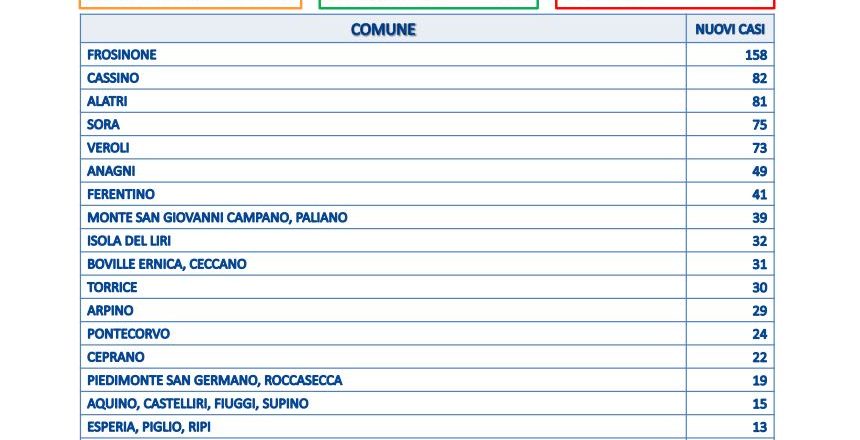 È Frosinone a contare più contagi: 158, segue Cassino con 82, Alatri con 81, Sora con 75, Veroli con 73. e poi 49 ad Anagni, 41 a Ferentino, 39 a Monte San Giovanni Campano e Paliano.