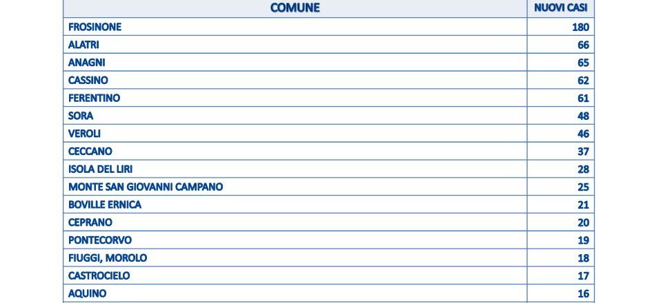 Boom di casi a Frosinone: 180, seguono Altri con 66, Anagni con 65, Cassino con 62, Ferentino con 61.