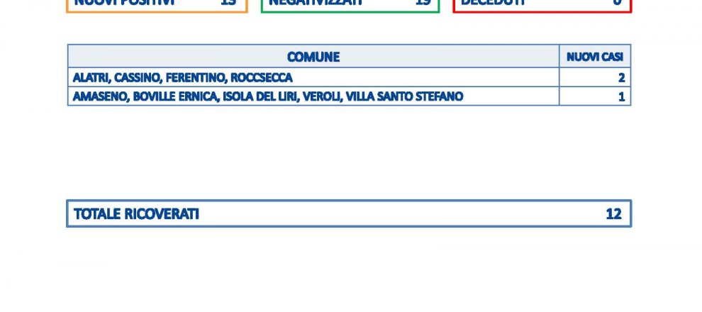 Covid – Sono 13 i nuovi casi in provincia di FrosinoneCronaca, In primo piano3 Ottobre 2021 3 Ottobre 2021 FROSINONE – Nelle ultime 24h sono stati effettuati 519 tamponi in provincina di Frosinone.Sono 13 nuovi casi di positivi al SARS-CoV-2.I negativizzati sono 19.I ricoverati sono 12.Non risultano decessi. Condividi sui social: Share on Facebook Share on WhatsApp Share on X (Twitter) Share on LinkedIn Share on Email Share on Telegram Navigazione articoli Previous Post Lazio – Comunali, affluenza sopra la media nazionale a mezzogiornoDalle Province, In primo piano3 Ottobre 2021Next Post Covid – Nel Lazio sono 278 i nuovi positivi e 3 i decessiCronaca, In primo piano3 Ottobre 2021