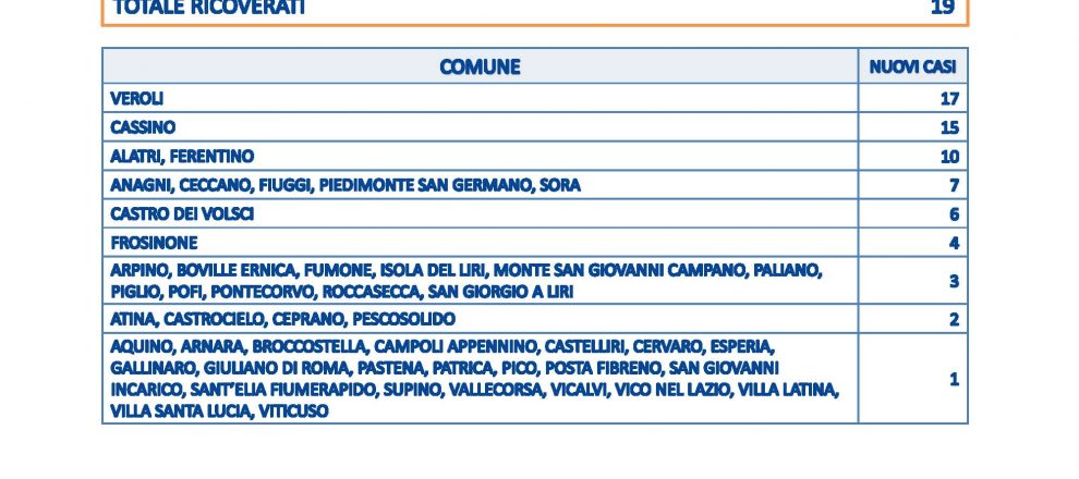 FROSINONE – 25 MAG – Uno dei dati piu’ bassi di sempre si registra oggi per la provincia di Frosinone: 160 nuovi casi. Non risultano decessi, sono 1.363 i tamponi processati, 356 i guariti, scendono a 19 i ricoverati. In doppia cifra solo 4 comuni, Veroli con 17 positività riscontrate, Cassino 15, 10 a Ferentino ed Alatri.