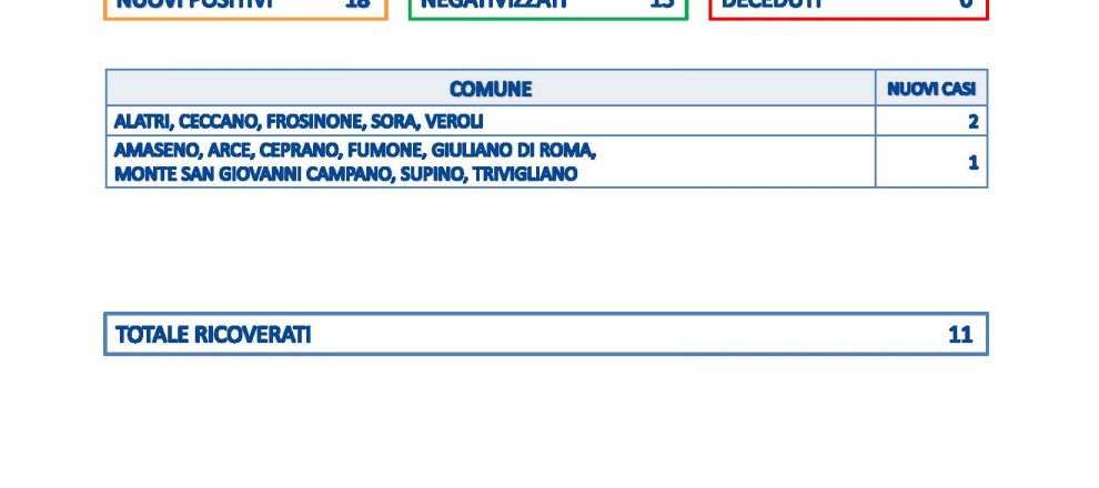 Covid – Sono 18 i nuovi casi in provincia di FrosinoneCronaca, In primo piano6 Ottobre 2021 6 Ottobre 2021 FROSINONE – 06 OTT – Nelle ultime 24h sono stati effettuati 722 tamponi in provincia di Frosinone. Sono 18 i nuovi casi di positivi al SARS-CoV-2.I negativizzati sono 15.I ricoverati sono 11. Non risultano decessi. Condividi sui social: Share on Facebook Share on WhatsApp Share on X (Twitter) Share on LinkedIn Share on Email Share on Telegram Navigazione articoli Previous Post Isola del Liri – Con la droga in cassaforte, arrestato un 51enneCronaca, In primo piano6 Ottobre 2021Next Post Covid – Oggi nel Lazio 245 nuovi positivi e 3 decessiCronaca, Dalle Province, In primo piano6 Ottobre 2021