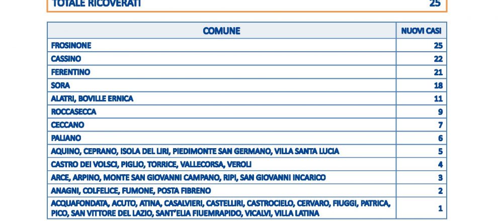 FROSINONE – Sono 211 i nuovi casi in provincia di Frosinone su 1.475 tamponi processati. Non risultano decessi, sono 25 i ricoverati , 432 i guariti. Il maggior numero di casi si è registrato a Frosinone con 25, seguono Cassino a 22, Ferentino 21, Sora 18, Alatri e Boville 11. Dai 9 ad un caso sono coinvolti altri 36 comuni della provincia di Frosinone.