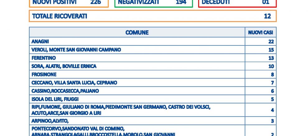 FROSINONE – 24 SET – Sono 226 i nuovi casi in provincia di Frosinone dove si registra anche un decesso. Si tratta di un uomo di 71 anni originario di Anagni. Sono 1119 i tamponi processati, 194 i guariti, 12 i ricoverati. Il numero che ha registrato il maggior numero di contagi à Anagni vcon 22, seguono Veroli e Monte San Giovanni Campano con 15, Ferentino con 13, Sora, Alatri e Boville Ernica con 10. Dagli 8 ad un caso sono coinvolti altri 46 comuni della provincia di Frosinone.