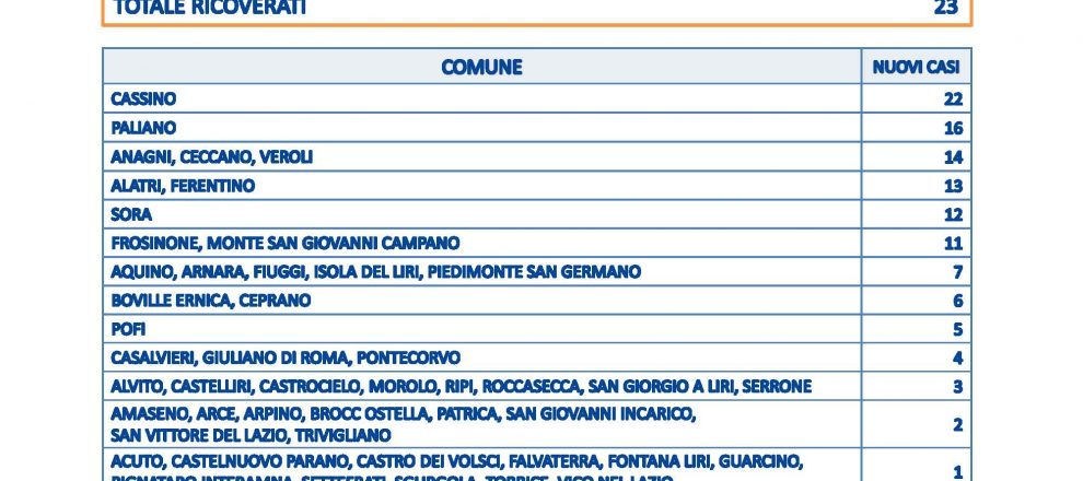 FROSINONE – Salgono i casi in provincia di Frosinone oggi a quota 255 su 1.427 tamponi processati. Non risultano decessi, i guariti sono 215, i ricoverati 23. La città di Cassino registra il maggior numero di contagi con 22, Paliano 16, Anagni, Ceccano e Veroli hanno registrato 14 casi. In doppia cifra anche Alatri e Ferentino a 13, 12 per Sora, 11 per Frosinone e Monte San Giovanni Campano. Dai 7 ad un caso sono coinvolti altri 39 comuni.