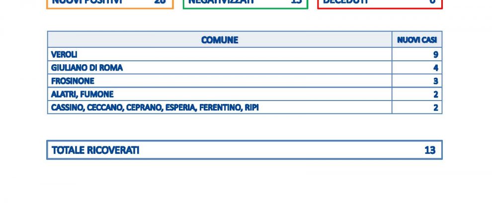 Covid – Sono 26 i nuovi casi in provincia di FrosinoneCronaca, In primo piano29 Settembre 2021 29 Settembre 2021 FROSINONE – Nelle ultime 24h sono stati effettuati 1024 tamponi. Sono stati registrati 26 nuovi casi di positivi al SARS-CoV-2.I negativizzati sono 15. I ricoverati sono 13. Non risultano decessi. Condividi sui social: Share on Facebook Share on WhatsApp Share on X (Twitter) Share on LinkedIn Share on Email Share on Telegram Navigazione articoli Previous Post Frosinone – Lockdown e P.S. pediatrici: nel 2020 accessi giù dell’81%Dalle Province, In primo piano29 Settembre 2021Next Post Covid – Nel Lazio 275 nuovi casi e 4 decessiDalle Province, In primo piano29 Settembre 2021