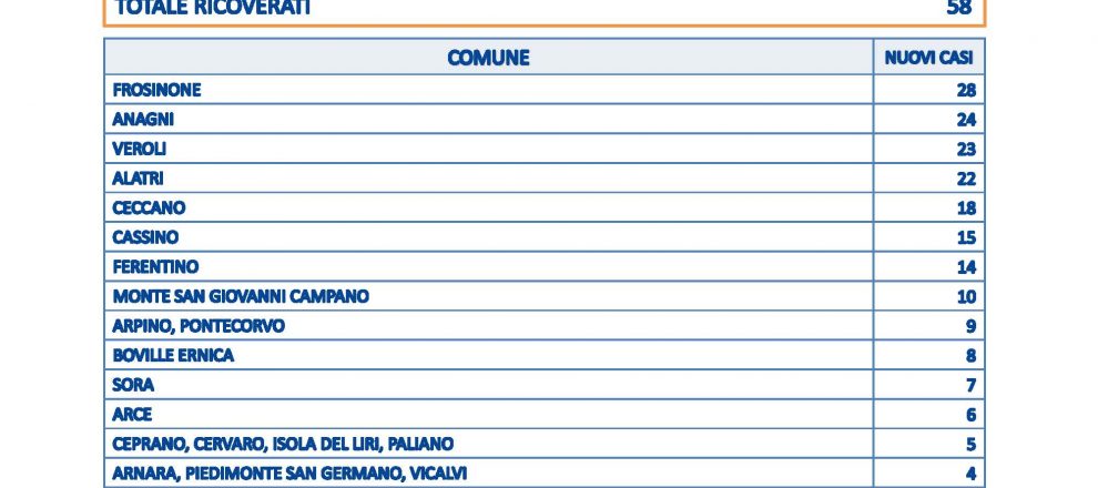 FROSINONE – Sono 307 i casi in provincia di Frosinone su 1770 tamponi processati, non risultano decessi. I guariti sono 693, 58 i ricoverati. Il comune che ha registrato il maggior numero di casi è Frosinone con 28, seguono Anagni con 24, Veroli 23, Alatri 22, Ceccano 18, Cassino 15, Ferentino 14. Dai 10 ad un caso sono coinvolti altri 58 comuni.