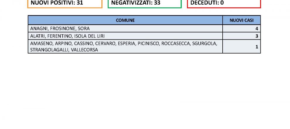 Covid – Sono 31 i nuovi casi in provincia di Frosinone e zero decessiCronaca, In primo piano20 Agosto 2021 20 Agosto 2021 FROSINONE – 20 AGO – Nelle ultime 24h sono stati effettuati 435 tamponi in provincia di Frosinone.Sono stati registrati 31 nuovi casi di positivi al SARS-CoV-2. I negativizzati sono 33. Non risultano decessi. Condividi sui social: Share on Facebook Share on WhatsApp Share on X (Twitter) Share on LinkedIn Share on Email Share on Telegram Navigazione articoli Previous Post Cassino – Da no vax a pro vax : la storia di forza e ‘rinascita’ di GiampieroCronaca, In primo piano20 Agosto 2021Next Post Ferentino – Atti persecutori alla ex, ai domiciliari un 36enneCronaca, In primo piano20 Agosto 2021