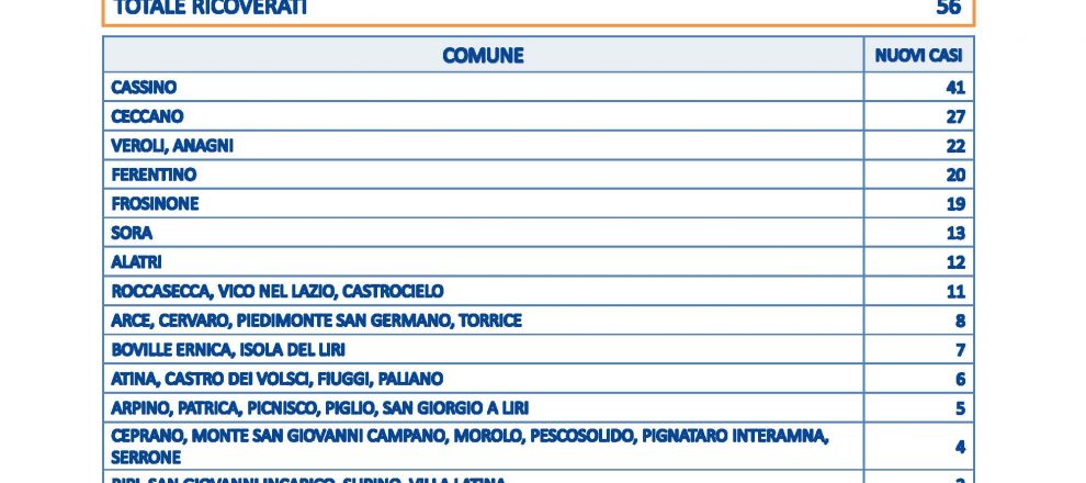 FROSINONE – 17 MAG – Sono 393 i nuovo casi in provincia di Frosinone su 2.655 tamponi processati. Si registrano 2 decessi, si tratta di una donna di 90 anni residente a Ceccano e di una 91enne residente a Boville Ernica. Sono 547 i guariti nelle ultime 24 ore. Cassino è la città che registra il maggior numero di contagi con 41, Ceccano 27, Anagni e Veroli 22, Ferentino 20. Sono 19 i nuovi casi a Frosinone, 13 a Sora, 12 ad Alatri, 11 a Castrocielo, Vico nel Lazio e Roccasecca.
