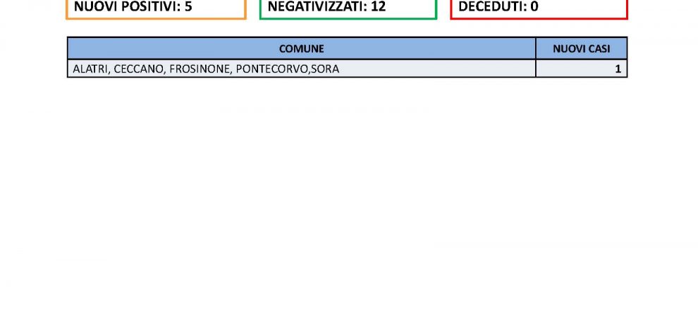 Covid – Sono 5 i nuovi casi in provincia di Frosinone e zero decessiCronaca, In primo piano15 Giugno 2021 15 Giugno 2021 FROSINONE – Nelle ultime 24h sono stati effettuati 667 tamponi in provincia di Frosinone, sono stati registrati 5 nuovi casi di positvi al Sars-CoV-, uno a Frosinone, Ceccano, Alatri, Pontecorvo e Sora.I negativizzati sono 12.Non risultano decessi. Condividi sui social: Share on Facebook Share on WhatsApp Share on X (Twitter) Share on LinkedIn Share on Email Share on Telegram Navigazione articoli Previous Post Lazio – Maturità 2021, mercoledì via agli esami. Anche quest’anno niente scritti: ci sarà il maxi-oraleDalle Province, In primo piano15 Giugno 2021Next Post Covid – Nel Lazio oggi 118 nuovi casi e 13 decessiCronaca, In primo piano15 Giugno 2021