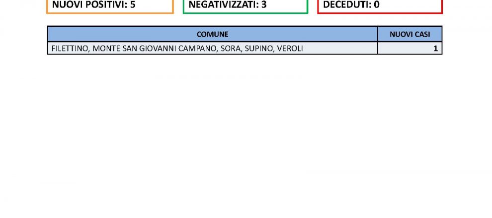FROSINONE – 19 LUG – Nelle ultime 24h sono stati effettuati 292 tamponi, sono stati registrati 5 nuovi casi di positivi al Sars-CoV-2.I negativizzati sono 3.