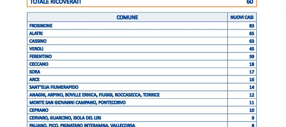 Frosinone – Sono 669 i nuovi casi ed un decesso nelle ultime 24 ore in provincia di Frosinone. La vittima è una 89enne di Monte San Giovanni Campano Sono 3.565 i tamponi processati, il tasso di positività è del 18,7%. Il maggior numero di casi si è registrato a Frosinone con 83. Sono 65 ad Alatri , 63 a Cassino, 45 a Veroli, 39 a Ferentino. Dai 18 ad un caso sono coinvolti 69 comuni. I guariti sono 626.