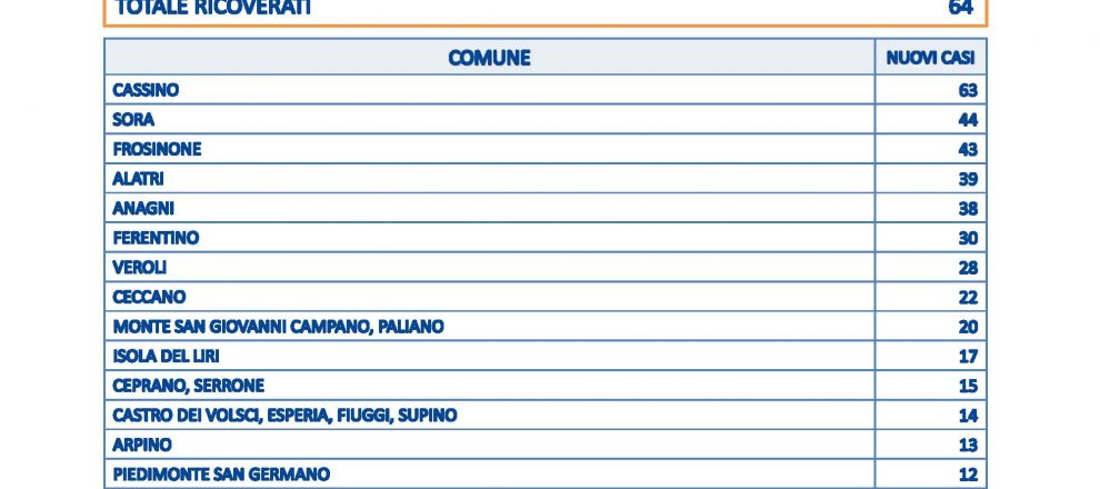 FROSINONE – Sono 714 i nuovi casi in provincia di Frosinone su 3.500 tamponi processati. Il tasso di positività è al 20,4%. E’ stato registrato un decesso: un uomo di 93 anni di Pico con pregresse patologie. Sono 439 i guariti e 64 i ricoverati. Il comune che ha registrato il maggior numero di casi è Cassino con 63, seguono Sora con 44, Frosinone 43, Alatri 39, Anagni 38, Ferentino 30. A quota 28 c’è Veroli, 22 per Ceccano. Dai 20 ad un caso sono coinvolti altri 66 comuni.