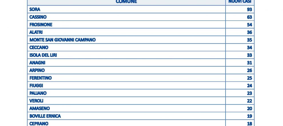 Covid – Sono 980 i nuovi casi in provincia di Frosinone, record a Sora con 93