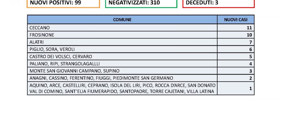 FROSINONE – 07 APR – Nella data del 6 aprile sono stati effettuati 1943 tamponi. Sono stati registrati 99 nuovi casi di positivi al coronavirus mentre i negativizzati sono stati 310. Il rapporto tra positivi e tamponi è al 5%.