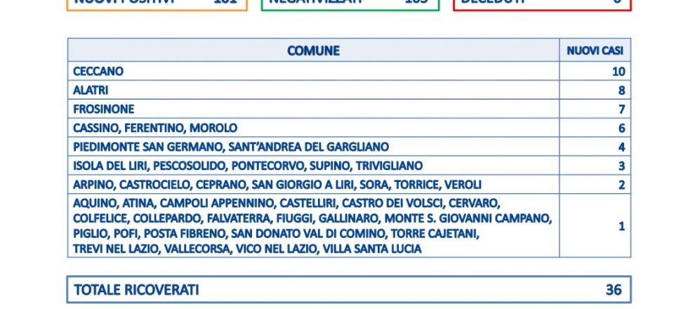La provincia di Frosinone torna a quota 100, 101 per la precisione oggi i nuovi casi su 1.385 tamponi processati, il tasso di positività schizza al 7,2%. Sale anche il numero dei guariti a 105. Il comune che ha registrato il maggior numero di contagi è Ceccano con 10, seguono Alatri con 8, Frosinone con 7. Sono 6 i casi a Cassino, Ferentino e Morolo, sono 4 per Piedimonte San Germano e Sant’Andrea del Garigliano, tre per Isola del Liri, Pontecorvo, Supino e Trivigliano. Due i casi per Arpino, Castrocielo, Ceprano, San Giorgio a Liri, Sora, Torrice e Verili. Ad un caso altri 21 comnuni della provincia di Frosinone. Fortunatamente non risultano decessi.