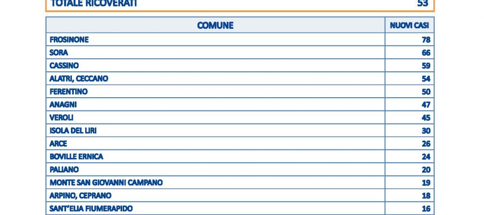 Frosinone 78, Sora 66, Cassino 59, Alatri e Ceccano 54, Ferentino 50. 78 i comuni coinvolti dal contagio.
