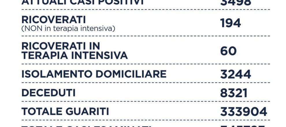 Zero decessi nelle province di Frosinone, Latina, Rieti e Viterbo.