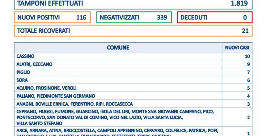 In provincia di Frosinone 116 nuovi casi su 1.819 tamponi processati. il tasso di positività è al 6,3%. Sono 339 i guariti, 21 i ricoveri.