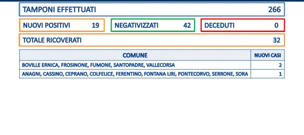Zero decessi e 19 positivi in provincia di Frosinone emersi su 266 tamponi. Il tasso di positività è al 7,1%. Ci sono 42 guariti, 32 i ricoveri.