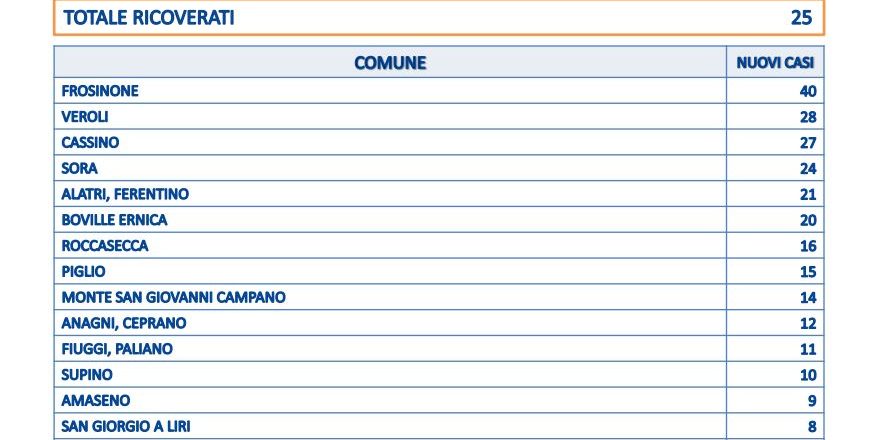 La città con più contagi è Frosinone a quota 40, seguono Veroli con 28, Cassino con 27. Poi sono 24 a Sora, 21 ad Alatri e Ferentino, 20 a Boville Ernica. 54 gli altri comuni interessati dai contagi.