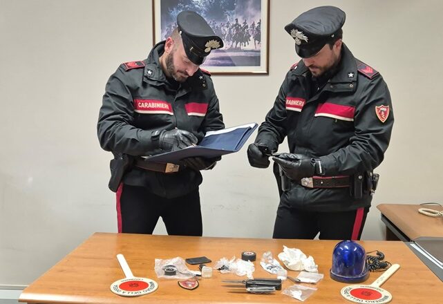 L’operazione è scattata quando i Carabinieri del Nucleo Radiomobile della Compagnia di Anagni hanno notato l’uomo che uscito da un Bar, alla vista dei militari, con fare irrequieto e nervoso, ha tentato di raggiungere velocemente il suo veicolo parcheggiato davanti all’esercizio pubblico, al fine di allontanarsi ed eludere l’eventuale controllo. L’atteggiamento dell’uomo non è sfuggito all’occhio dei Carabinieri che lo hanno subito bloccato impedendogli di allontanarsi. Le indagini non si sono fermate lì: presso l’abitazione del 40enne, i militari, a seguito della successiva perquisizione domiciliare, hanno trovato un lampeggiante di colore blu, del tipo in uso alle Forze di Polizia, ritagli in cellophane e materiale utile per il confezionamento delle dosi di stupefacente da immettere sul mercato locale. Lo stupefacente insieme ai coltelli ed al materiale per il confezionamento e pesatura sono stati sottoposti a sequestro mentre, l’uomo, su disposizione del Sostituto Procuratore di turno presso la Procura della Repubblica di Frosinone è stato ristretto in regime degli arresti domiciliari presso l’abitazione di Ferentino .