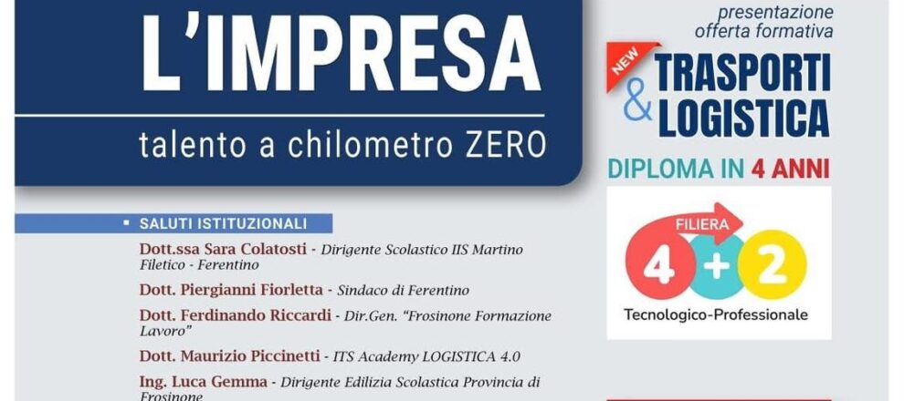 Il convegno “L’Aula incontra l’Impresa” rappresenta un’importante iniziativa per il territorio di Ferentino. L’appuntamento è per lunedì 2 febbraio nel salone di rappresentanza del Liceo Filetico di Ferentino dalle 11:30 alle 13:30, quando sarà presentato il nuovo progetto didattico 4+2 “Trasporto e Logistica”, novità assoluta nel panorama scolastico del territorio frusinate, ma anche laziale.