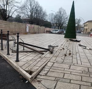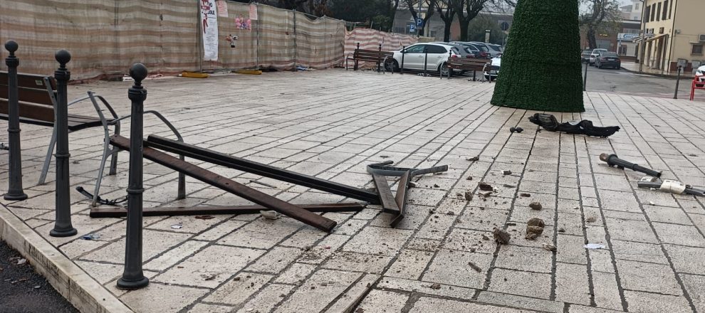 Panchine danneggiate e dissuasori distrutti nella piazza antistante il sagrato della chiesa della Sacra Famiglia, a Frosinone, nella zona Scalo del capoluogo.