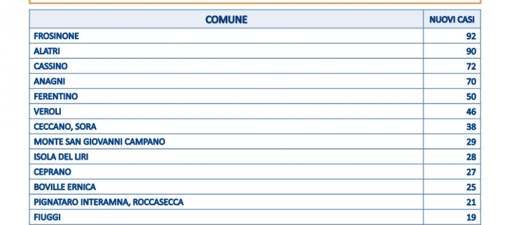 Andando alla mappa dei contagi, la città dove si registra il numero maggiore di nuovi casi è Frosinone con 92. Seguono Alatri con 90, Cassino con 72, Anagni con 70, Ferentino con 50. Alto anche il numero dei guariti, sono 933