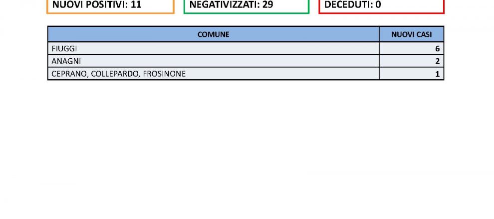 Sono 11 i positivi al Covid nelle ultime 24 ore in provincia di Frosinone. Di questi sei arrivano dalla città di Fiuggi, tutti appartenenti ad un unico nucleo familiare. Il tasso di positività, a fronte di 308 tamponi effettuati, risale al 3,5% circa. I negativizzati sono 29 e non si registrano decessi. Oltre ai sei casi di Fiuggi troviamo due casi ad Anagni ed un caso a testa per Ceprano, Collepardo e Frosinone.