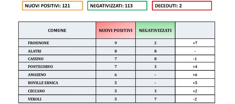 Quasi mille tamponi eseguiti e 121 nuovi positivi. Sono i numeri del bollettino della Asl di Frosinone, che conta anche 113 negativizzati.