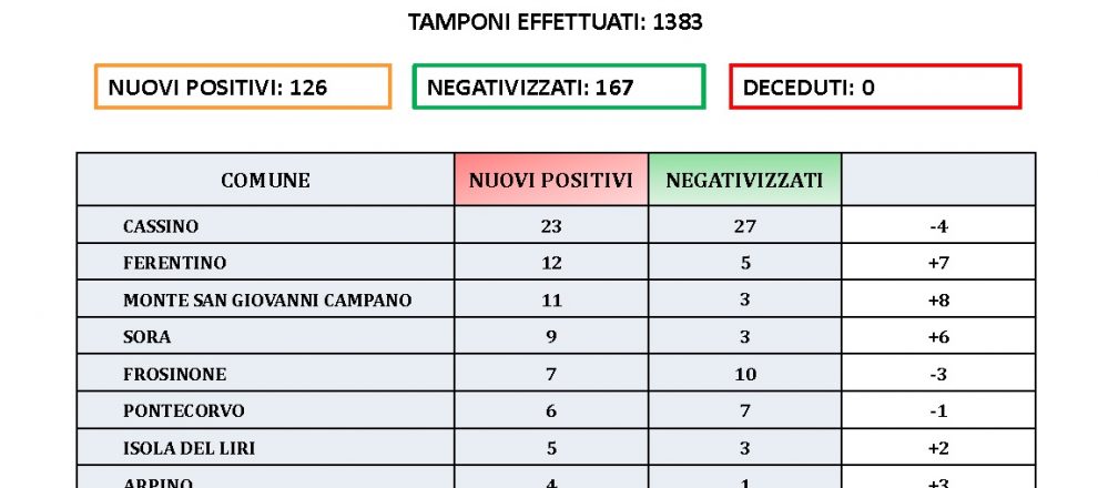Frosinone – Covid, 126 casi e nessun decesso. Scende al 9% il rapporto tra positivi e tamponi