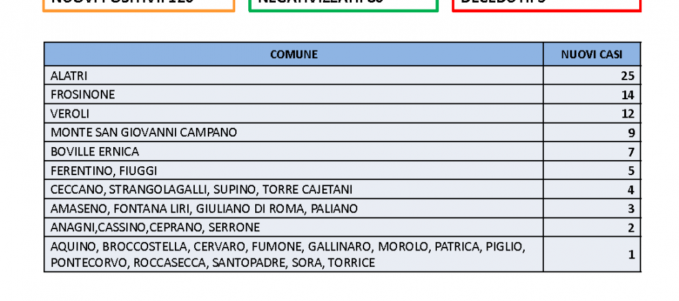 Sono stati registrati anche tre decessi nelle ultime 24 ore di residenti in Provincia di Frosinone: una donna di 51 anni residente a Boville Ernica, un uomo di 65 residente ad Alatri e una donna di 88 anni residente a Veroli.