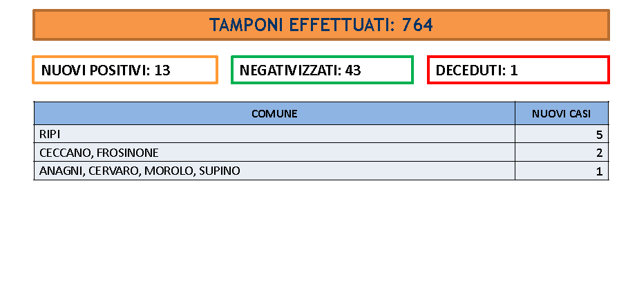 13 nuove positività in ciociaria su 764 tamponi processati. 43 i negativizzati.