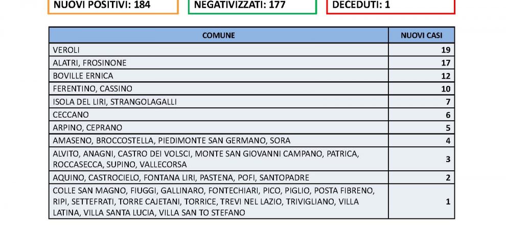 Sono 184 i nuovi positivi al Covid nelle ultime 24 ore. I casi scaturiscono da 2154 tamponi effettuati con un tasso di positività stabile all’8,5%. L’unico decesso registrato riguarda una donna di 77 anni residente a Frosinone. I casi sono così distribuiti: 19 a Veroli, 17 a Frosinone ed Alatri, 12 a Boville Ernica, 10 a Ferentino e Cassino, 7 ad Isola del Liri e Strangolagalli, 6 a Ceccano e 5 ad Arpino e Ceprano.