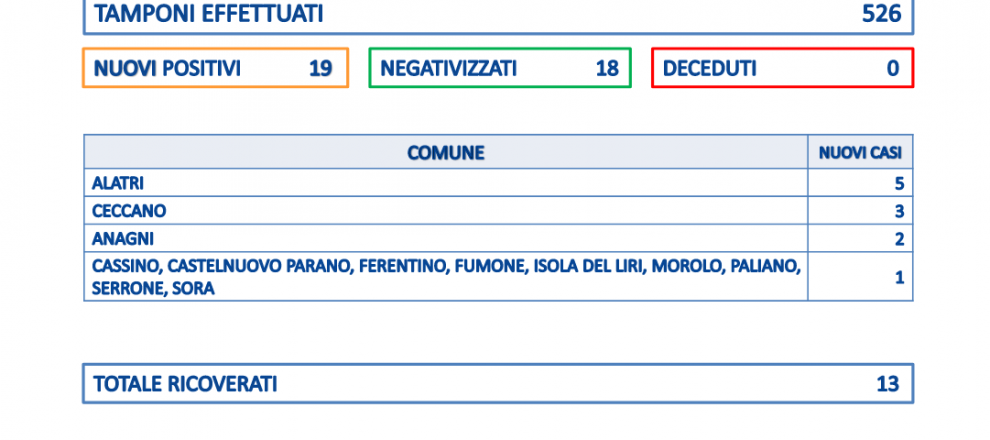 19 nuovi contagi in provincia di Frosinone a fronte di 526 tamponi processati nelle ultime 24 ore. Sale il numero dei pazienti ricoverati, tre in più rispetto alla giornata di domenica.