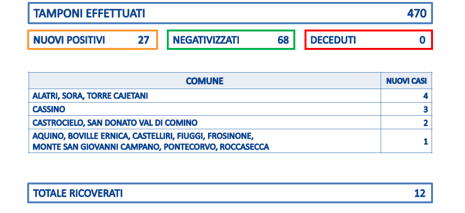 27 i nuovi contagi accertati sabato in provincia di Frosinone a fronte di 470 tamponi processati. Con un tasso di positività che si attesta al 5,7%.