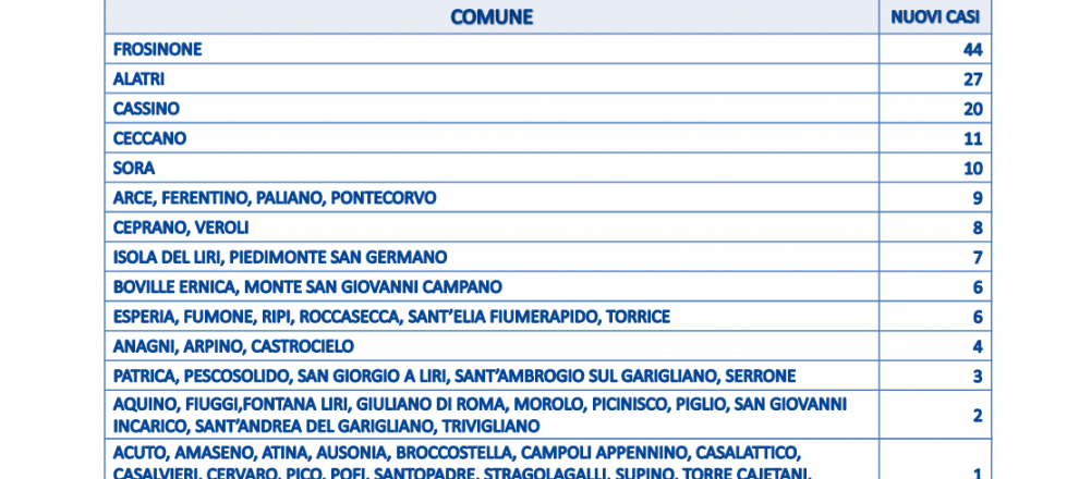 Casi Covid in aumento in provincia di Frosinone, ma aumento anche dei tamponi effettuati e questo fa sì che il tasso di positività sia invariato, al 7,85%. I nuovi positivi sono 286, individuati in 58 diversi comuni, a fronte di oltre 3600 tamponi effettuati, nuovo record di sempre per quel che riguarda i test. I guariti sono 146 e non si registrano decessi. Stabili i ricoveri che restano 61. Frosinone in testa con 44 casi, poi Alatri 27, Cassino 20, Ceccano 11, Sora 10. Con 9 casi Arce, Ferentino, Paliano e Pontecorvo. A Veroli 8 nuovi positivi così come a Ceprano. Ad Isola del Liri e Piedimonte 7, A Boville Ernica e Monte San Giovanni Campano 6. Poi altri 43 comuni da 5 casi a scendere.