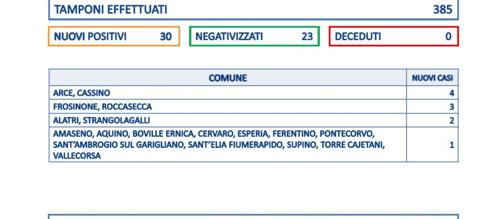 Ancora 30 casi in provincia di Frosinone, la metà rispetto a quelli registrati nella giornata di martedì. Sono emersi da 385 tamponi processati, con un rapporto del 7.7%. A Cassino ed Arce di registrano 4 casi, 3 a Frosinone e Roccasecca, 2 ad Alatri e Strangolagalli. 1 ad Amaseno, Aquino, Boville, Cervaro, Esperia, Ferentino, Pontecorvo, Sant’Ambrogio, Sant’Elia, Supino, Torre Cajetani e Vallecorsa.